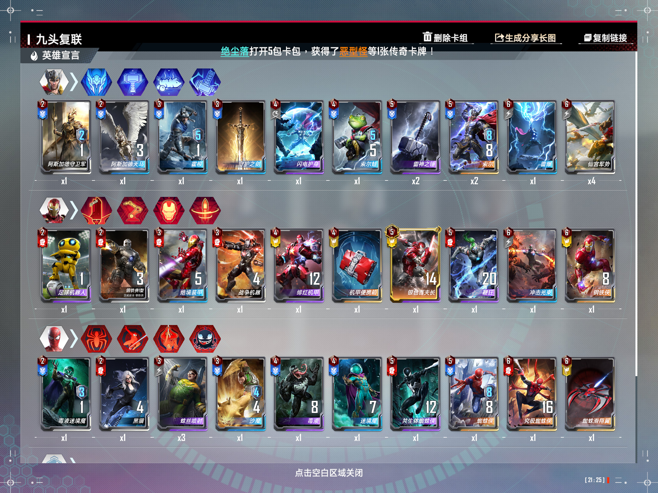 核心思路就是,尽量快速到五本,然后寻找复仇者组件,稳住血量。在茫茫多的九头蛇的环境里,几乎一张索尔一张美队就没有敌手了。