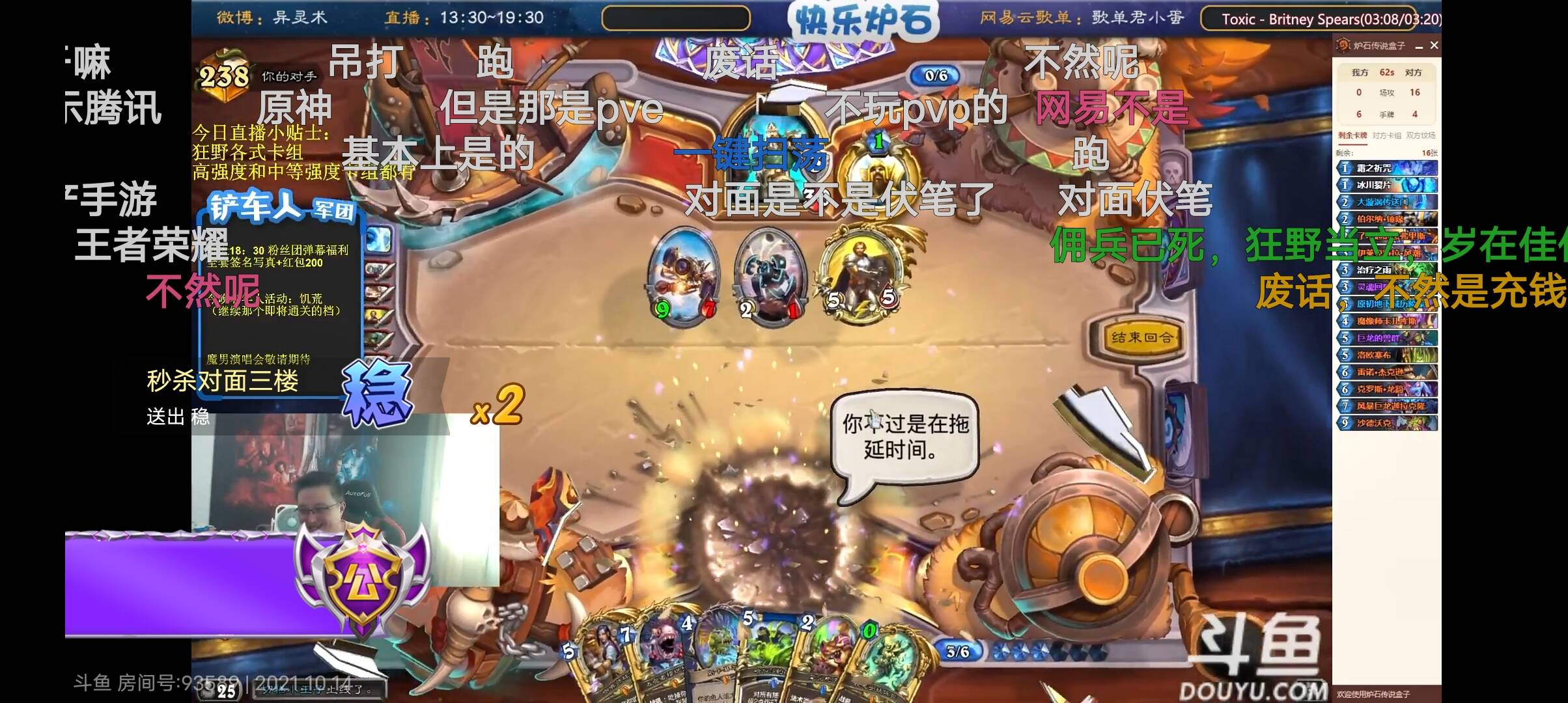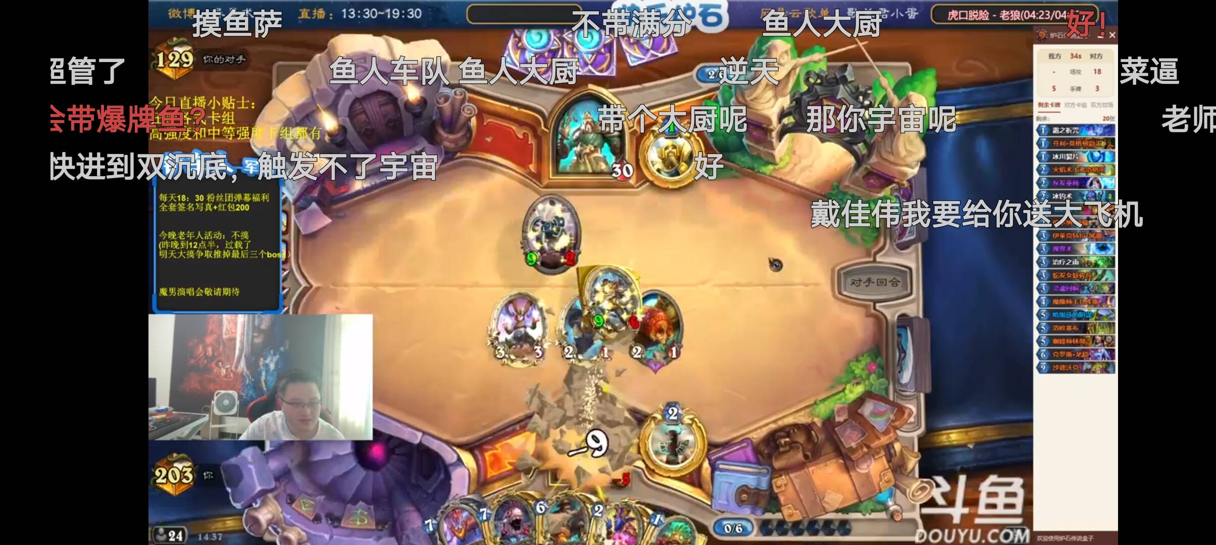 默认战吼萨,优开,对面解场的只有毒鱼一套和姐夫。我们和容易防,毒鱼最怕的就是圣盾和复生,值得注意的是前期能解场就解场,不要给萨满毒鱼还能返场的机会。