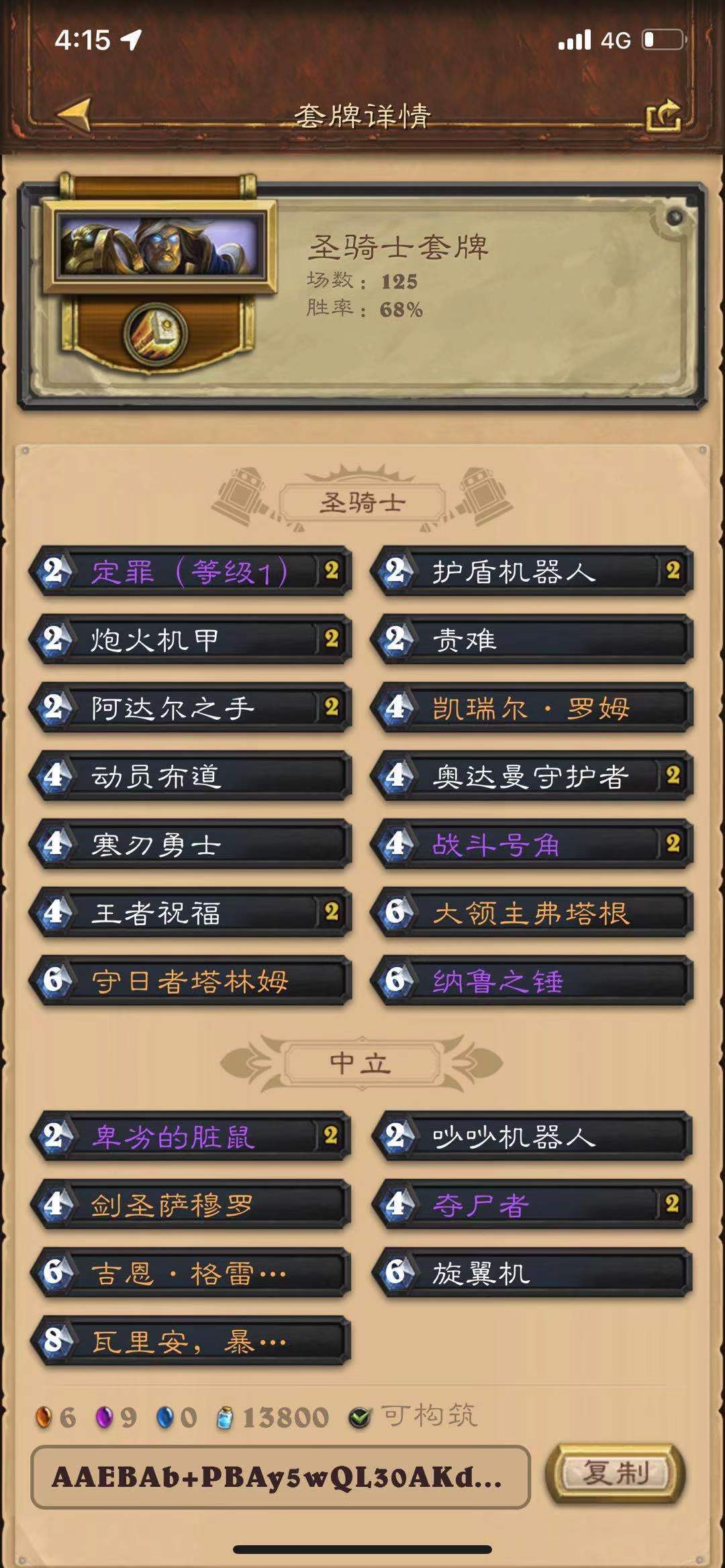 这套卡组和常规偶数骑的区别在于舍弃掉了打鬼灵和点燃法很好用的前沿哨所,只带一张责难避免卡手,圣盾复生拉满用来打猎人和快攻内战。434奥达曼用来处理偶数术的大哥,这套牌的圣盾牌数量极多,655只要能上场一局基本稳吃两个buff。一费摇报告的技能让这套牌无比润滑,可以说这套牌打当前环境的任何一套卡组都有一战之力。