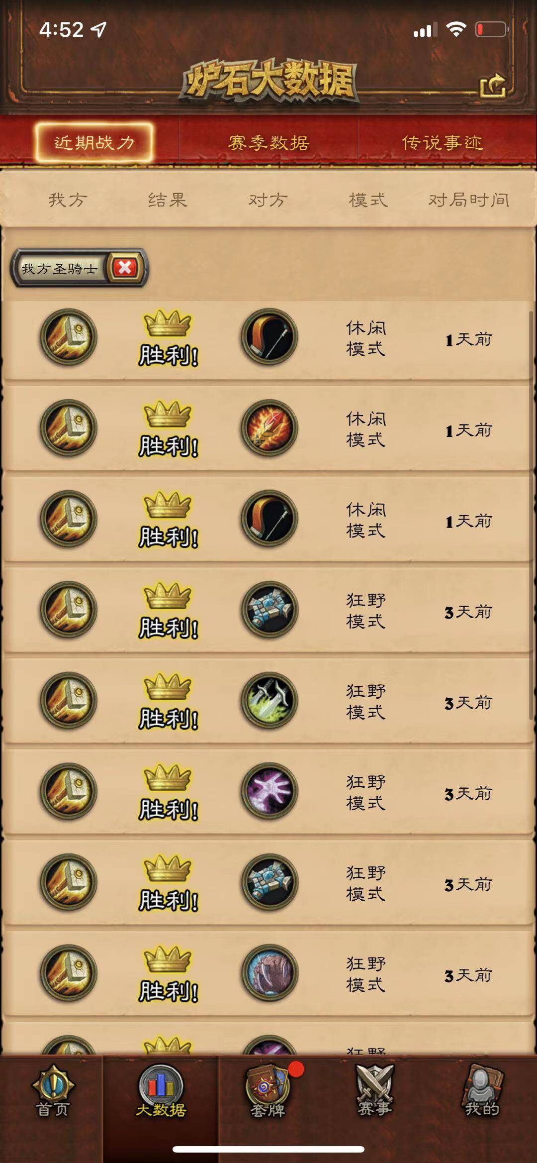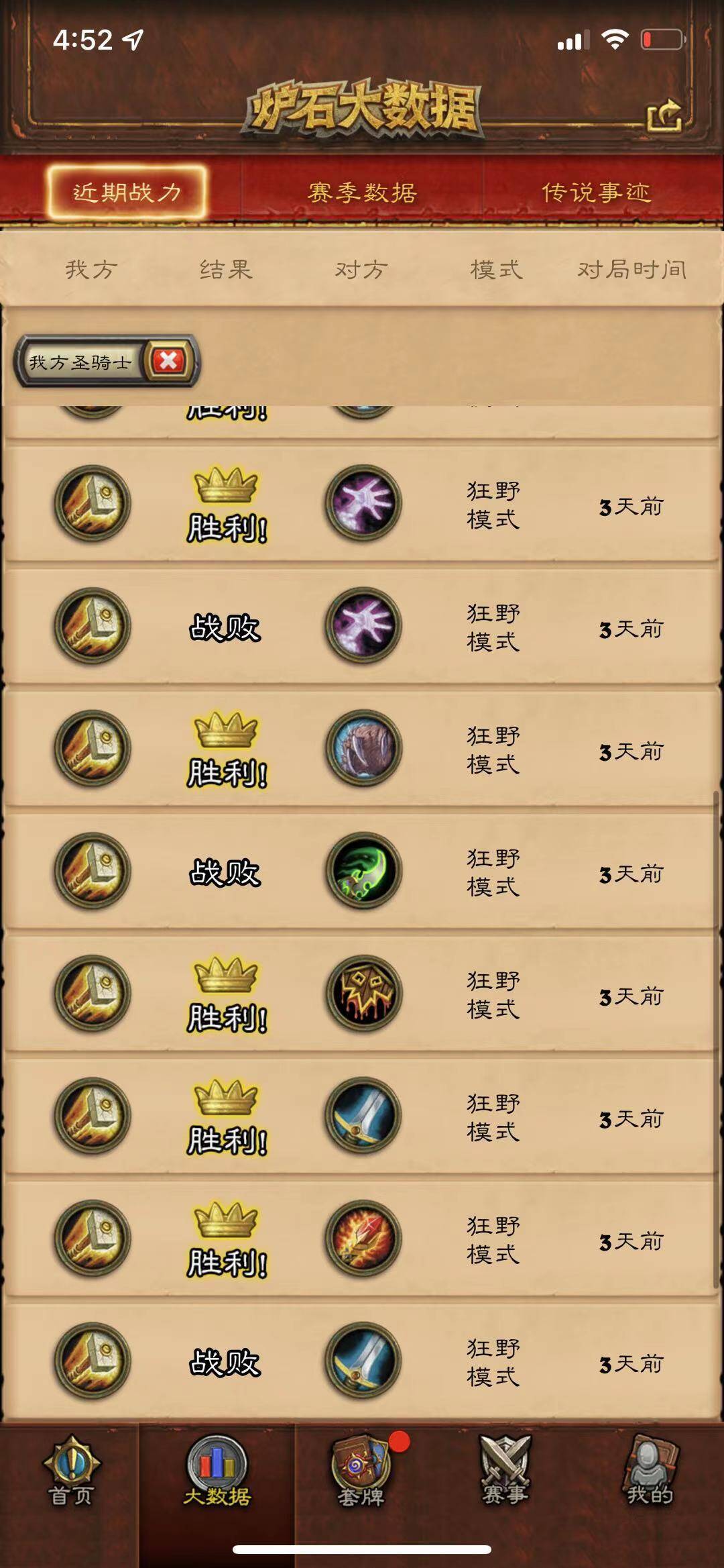 因为我没有用盒子的习惯所以职业对局胜率实在难看到,不过这套偶数骑优势对阵狂野主流的奇数猎,暗牧,奇数贼。五五开对局偶数术,小劣海盗战。