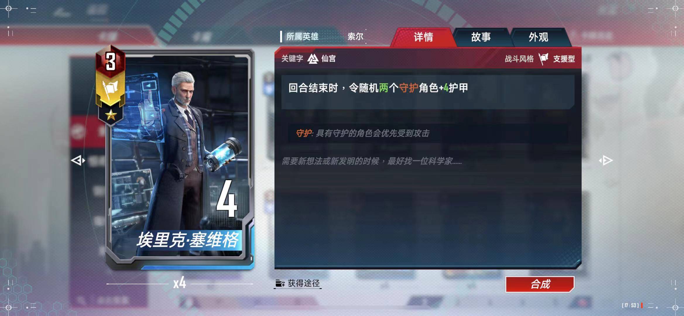 叠甲复仇者的叠甲就是源自这张牌,由于蓝队复仇者需要挨打来增加战斗力,给他们通过上面三种装备贴上守护并让埃里克站在场上叠甲就非常重要了,埃里克什么时候来,他能给复仇者们贴多少甲在一定程度上影响复仇者能多膨胀多少战斗力,非常重要。