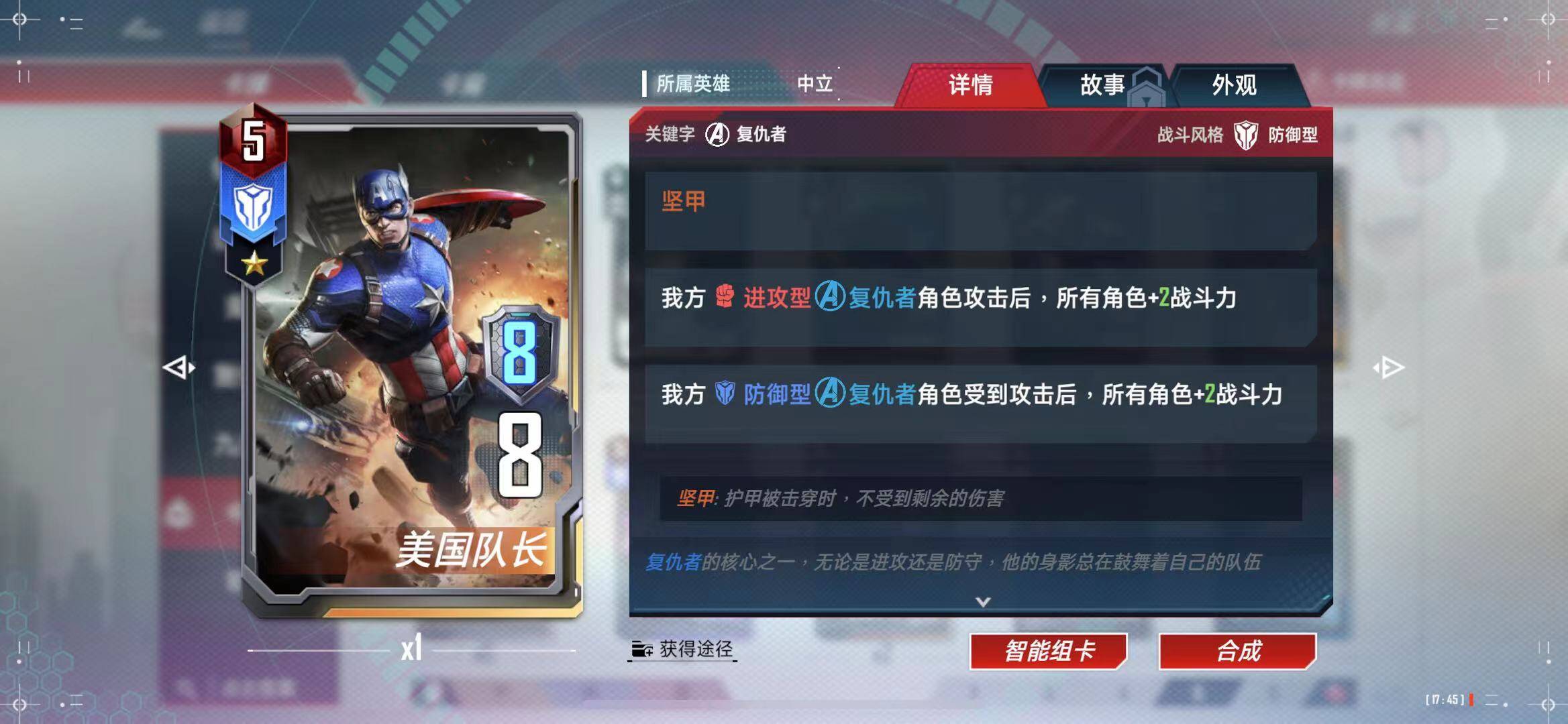 美国队长是叠甲复仇者卡组的战斗力来源,美队的技能能在队友的浩克 索尔和蜘蛛侠挨打的时候很明显地增加阵容厚度,由于叠甲复仇者中大部分蓝队单卡有极高护甲(埃里克·塞维格和浩克提供),阵容的成长性非常不错,配合浩克和索尔自带的强化反击输出不俗。尽量满编,在三个核心都到齐了之后大概率锁血,没有美队的话复仇者卡组的厚度不够,强度不高。