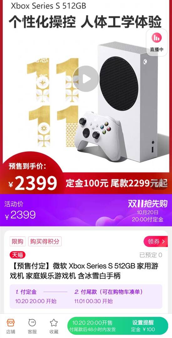 天猫商城微软中国官方旗舰店上线Xbox Series S国行主机双十一活动预售页面,主机将在今晚8点开启预售,定金100元,尾款支付在11月1日00:30开启,预售总价2399元。想购入XSS主机的朋友可以先收藏一下商品,等预售开启下单。