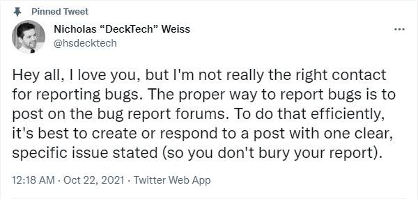 【发行部门的DeckTech昨天也刚吐槽过bug最好反馈到论坛而不是告诉他】