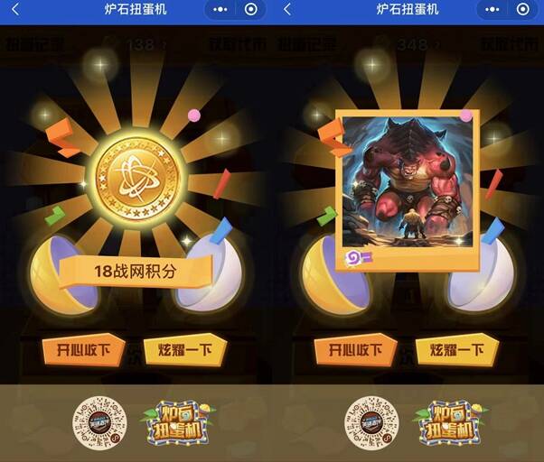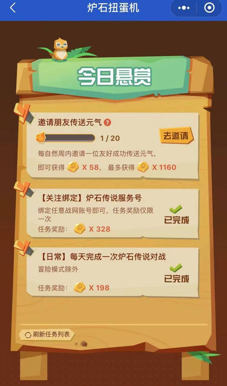 自从佣兵模式上线,炉石日常任务量陡增,斗鱼、虎牙等地也推出了做任务拿奖励的活动,现在又轮到了炉石官方的微信公众号。炉石官微今天上线了新的小程序“炉石扭蛋机”,也是通过做任务换取战网点等奖励……的抽奖机会。