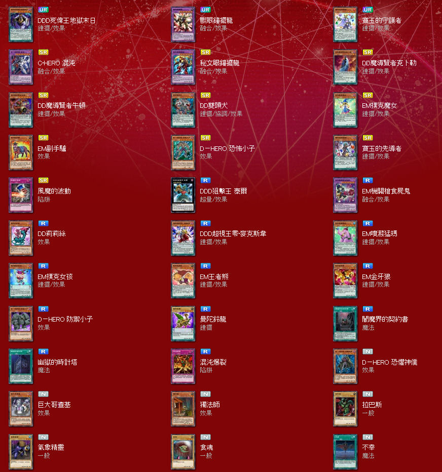 灵摆怪兽主要以DDD为主,宝玉因为只有2张,所以全收录了。开普勒、死伟王、狙击王和双头犬都是对DDD系列有意义的卡片。娱乐伙伴则是把没出的一堆卡中出一些。之前不敢开放的命运-英雄幽狱计时塔相关也开放了出来,还开放了混沌-英雄。