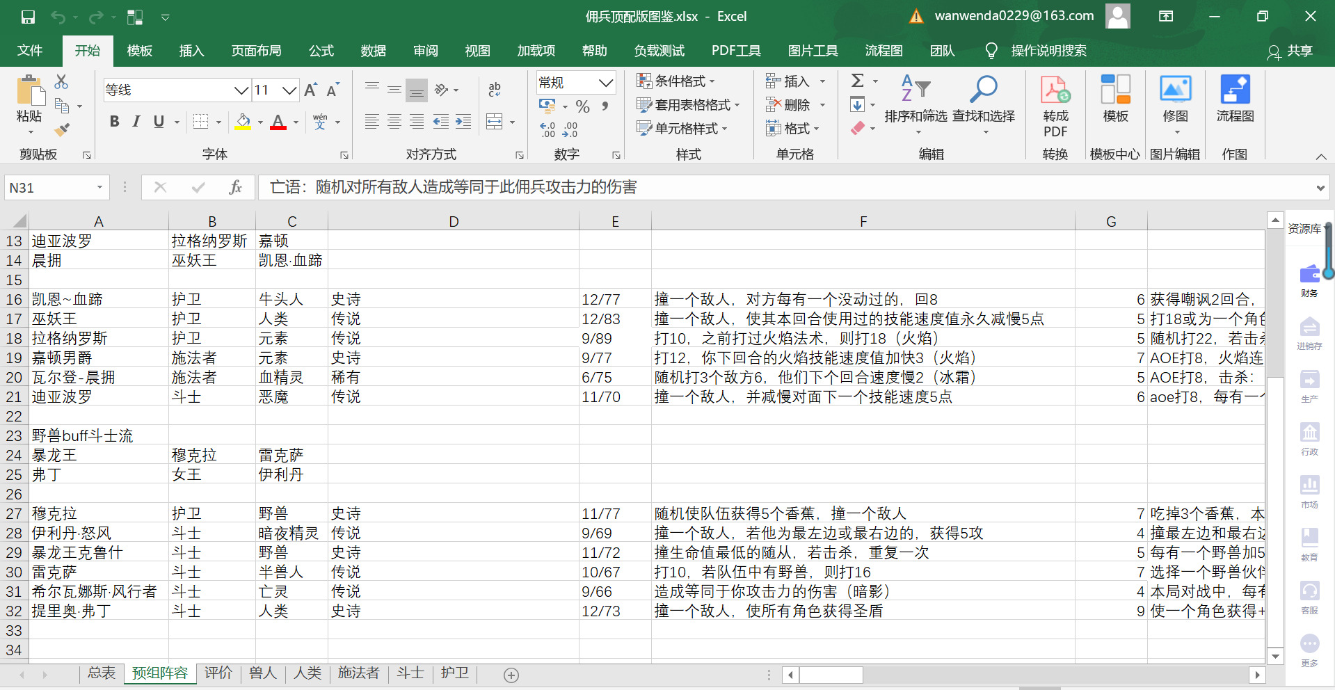 下图为我9月进行预构筑时的excel截图,我首先与御坂兄弟对每张单卡进行了一定的评价,然后挑选了我们认为最厉害的几张核心单卡展开构筑,于是一套以迪亚波罗为核心的加减速卡组就应运而生,我也在第一时间爆肝了个七七八八后就上天梯尝试,并于10.15打上8000分,但在天梯过程中我渐渐发现这套的致命弱点———斗士只有一张迪亚波罗,且极易被秒,之后面对蓝色阵容容易缺乏伤害导致被单刷(说的就是你,安度因),于是在翻遍斗士卡池之后,我找到了刀油这张最高可以秒法师50的斗士单卡,可是2技能毕竟有cd,而其他技能又过于不行,可以说是无奈之举。这时流浪兄弟给我提了雷矛这张一直被我忽视的单卡,1技能无cd 可打50,2技能又可配合火焰连击,简直不要太完美!!!最终将巫妖王替换成雷矛之后,我于10.16打上9000分,完成登顶!