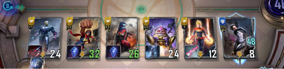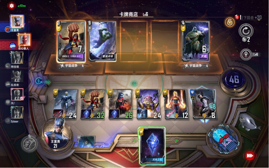 (3)援军角色,中期的时候一定要打出,可以无偿滤牌库,霍华德鸭可以白赚1宝石,火箭与格鲁特实际上还白赚取一次刷新的机会;