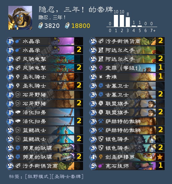 这个时候我就想起了当初的污手骑,定罪和螃蟹阿尔达之手还没被砍,称霸天梯,动戈就是20多点斩杀。于是便照着不休饥渴小碎骨的月报,以及自身实践,拼拼凑凑打造出了这个污手冲锋骑。