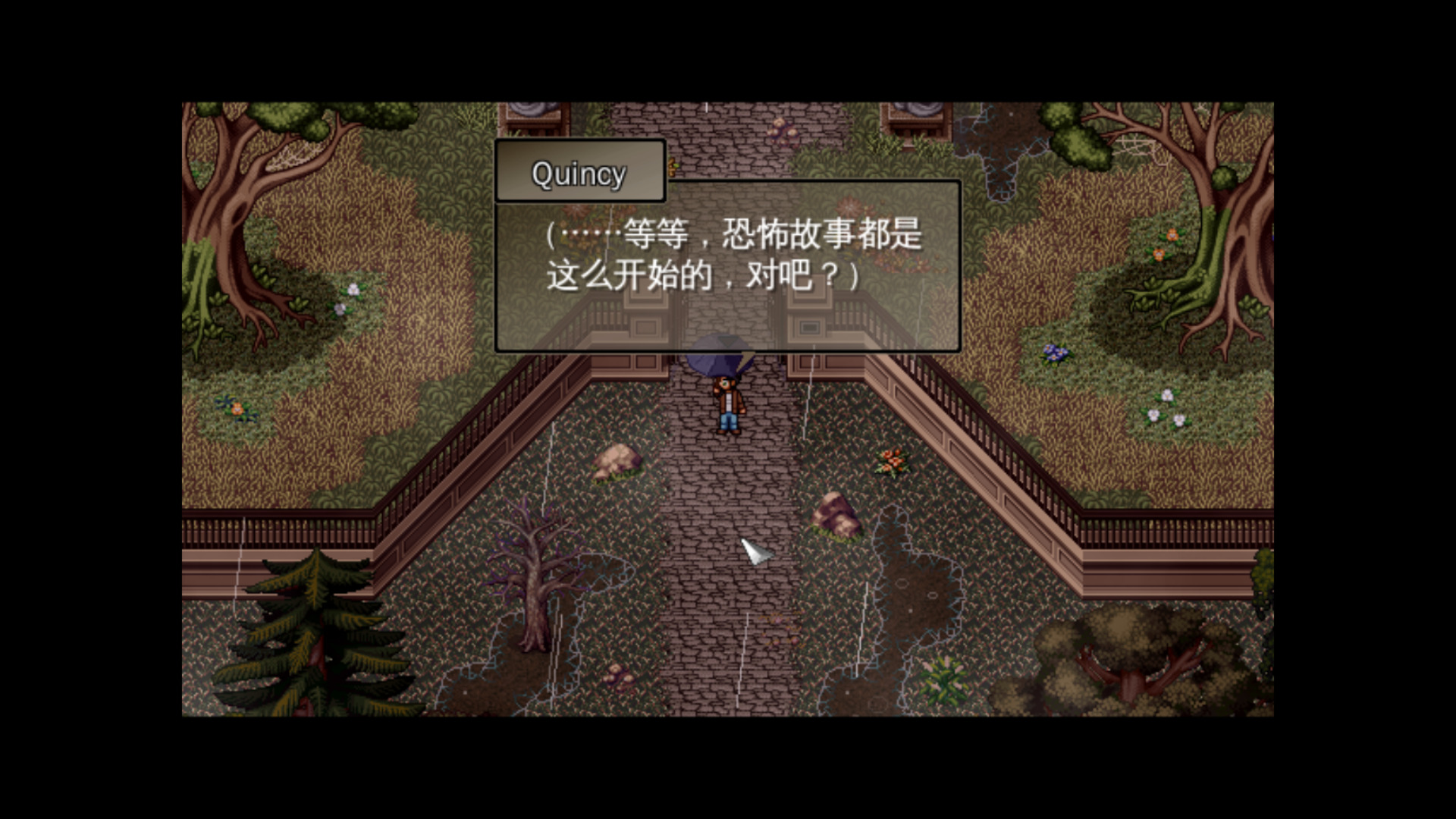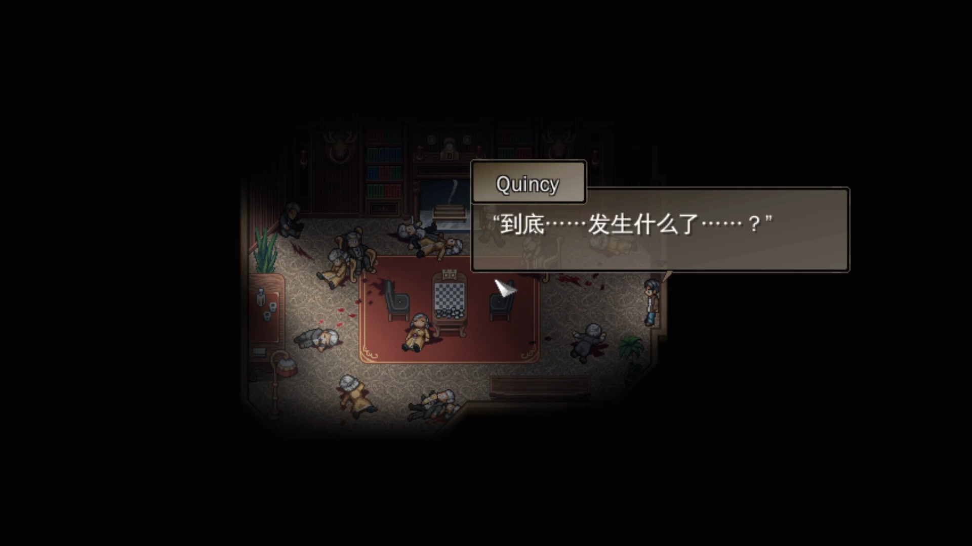 游戏的前半段说的是一名叫昆西的男子打着伞在大雨天来到了一个偏僻的豪华别墅参加派对。这是一个一看就很可疑的派对,来这里干什么他不明白,为什么要来,他也不明白。