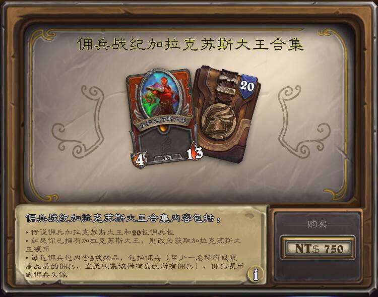 根据玩家自身情况可能出现,含1张指定传说佣兵和对应的200枚硬币,国服售价128。