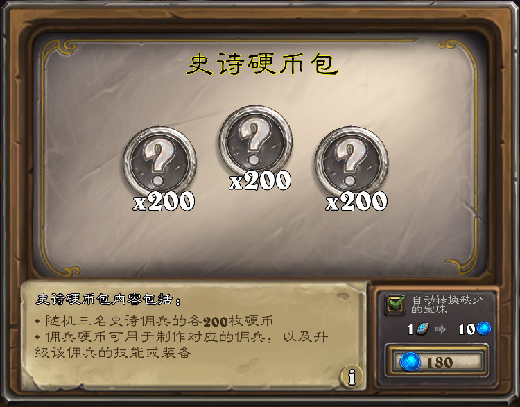 根据玩家自身情况可能出现,含1张指定史诗佣兵和对应的200枚硬币,国服售价30。