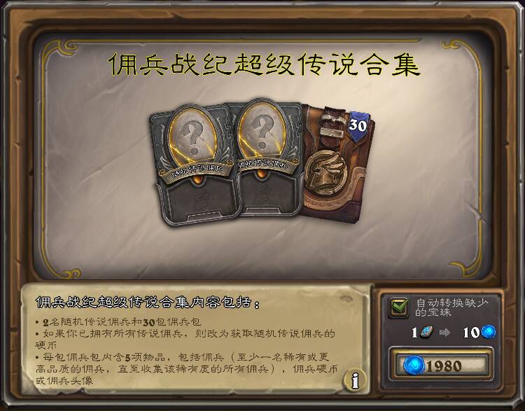 根据玩家自身情况可能出现,含1堆300枚指定传说佣兵的硬币,国服售价30。