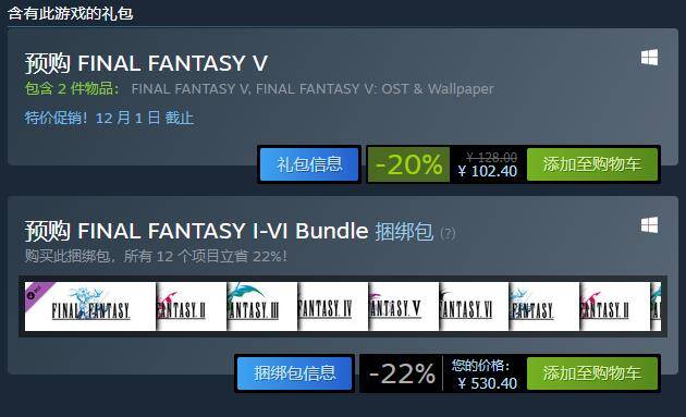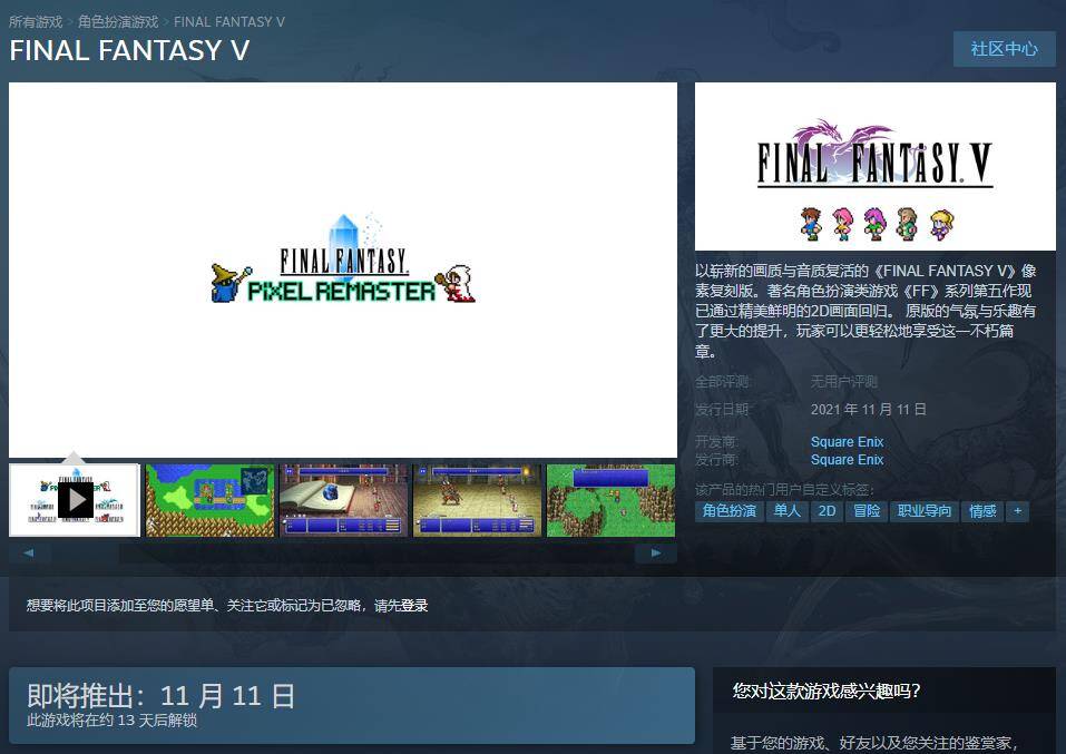 近日SE宣布《最终幻想5》像素复刻版在Steam上开启预购,售价128元,现在特价促销售102.4元,活动截止12月1日结束。游戏将于11月11日正式发售,支持简体中文。现在预购即可获得特别原声带(三首乐曲)和壁纸(两种)。