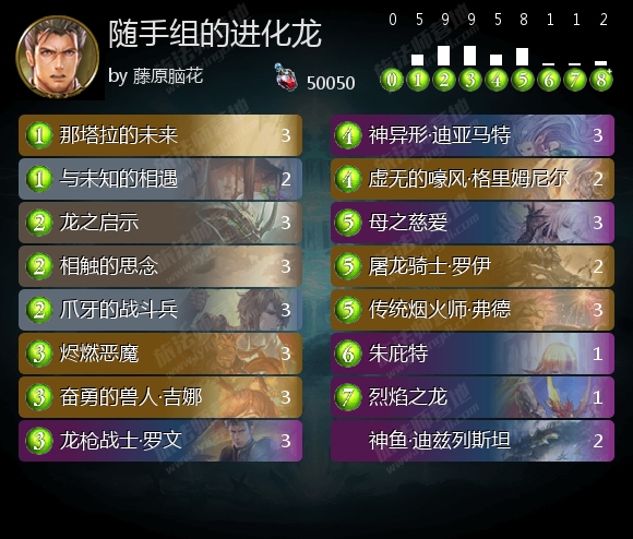 目前比较常见的构筑是下面这套自然进化龙。进化龙和罗文的相性主要来自丰富的解场手段,还有虚无的嚎风·格里姆尼尔。前者让黑龙诅咒的伤害更容易打到脸上,后者配合罗文的弑龙之枪可以单卡打出15点直伤,既提高了斩杀线,也提高了下限,不由得让人梦回首饰风军combo的年代。除此之外,黑龙的诅咒和弑龙之枪还有很多其他的配合,比如利用弑龙之枪为爆能的屠龙骑士·罗伊和传统的烟火师·弗德的直伤能力进行两次的加成并清场来让黑龙的诅咒稳定打脸,等等,用法有很多。我自己首先选择了这套卡组,打出了10场9胜的数据,并且根据连胜统计数据来看,龙族的高连胜卡组暂时也是最多的,应该说在环境初期,罗文还是比较可靠的,或许未来还会有疾驰自然龙或者载具龙之类的思路借助罗文上位。