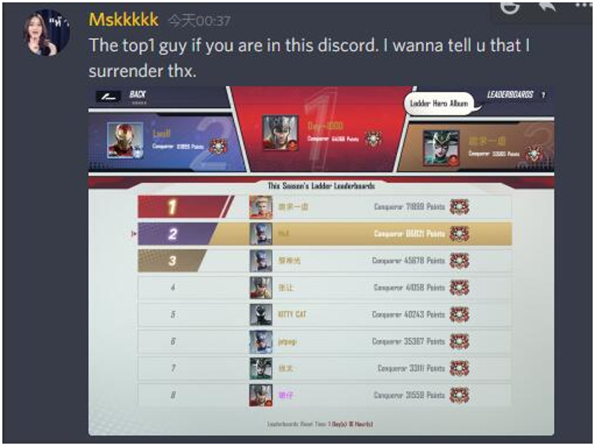 独自在外服冲分,很艰辛,需要克服的困难也相对较多。他也曾想要放弃,好在在国际服征战的这些日子里,虐哥也收获了不少的乐趣,最让他记忆深刻的,莫过于今年年初的那场冲分之旅,虐哥在泰国首席玩家MSK手中强势夺回榜一,打得MSK在discord上直接服软,这份莫名的荣耀感立刻冲上心头,当然在后来,他也与这位泰国高玩成为了好朋友。