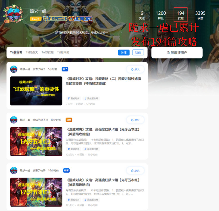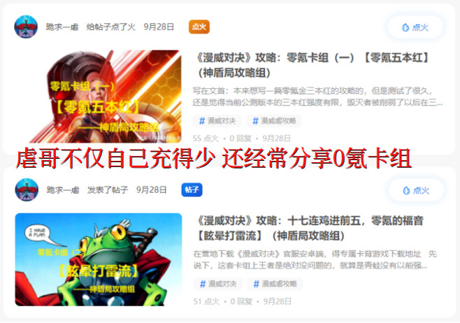 更让人难以忘却的是,他在全网尤其是旅法师营地上发布的卡组攻略,帮助了成千上万的新人玩家快速入门,也因此成为了大家口中的“带头大哥”。并且,大家以他为偶像和目标,开启了属于自己的漫威对决之旅。
