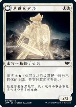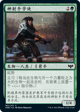 每当你施放生物咒语时,派出一个1/1白绿双色人类士兵且具有见习。