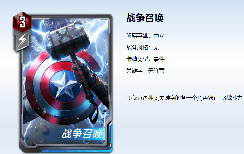 这里讲一下中立卡战争召唤,不要买太早,此卡要在场上至少有三个关键字的时候打出,比如我们有特工,诸神黄昏,蜘蛛侠,复仇者4个关键字,这样打出就是3费加了12战力,对比中立卡恶形怪突袭仅仅持续一回合的10战力可要赚多了。