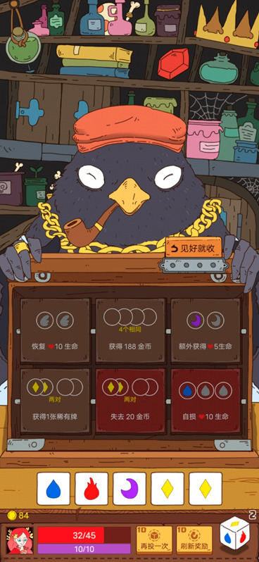 在商人房中,你会遇到这么一只……憨态可掬的奸商。通过投出骰子的元素,可以获取相应的收获奖励。是见好就收,还是搏一搏全都要,就看你的运气了。