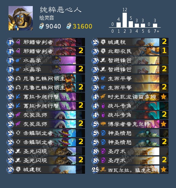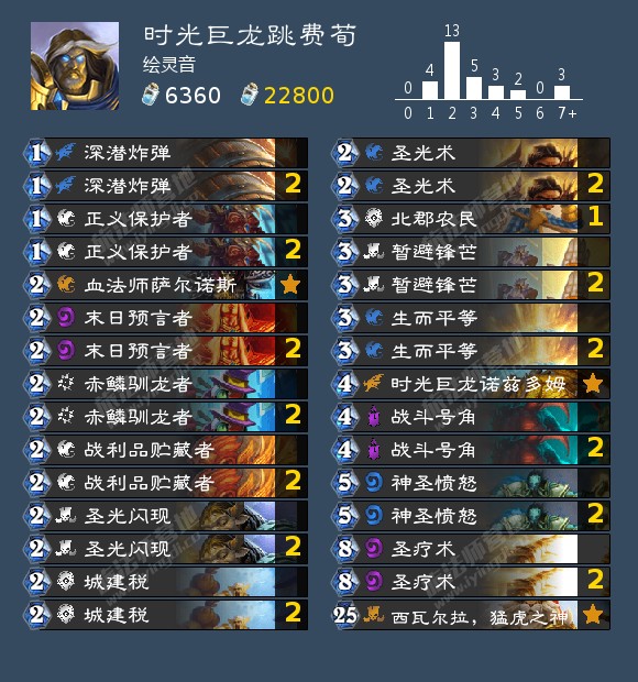 这套构筑强化生存能力,通过号角和驯龙者的配合,拿到时光巨龙跳到10费开打,然后通过圣疗术高效过牌凑齐组件