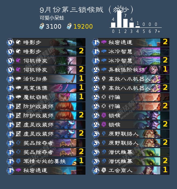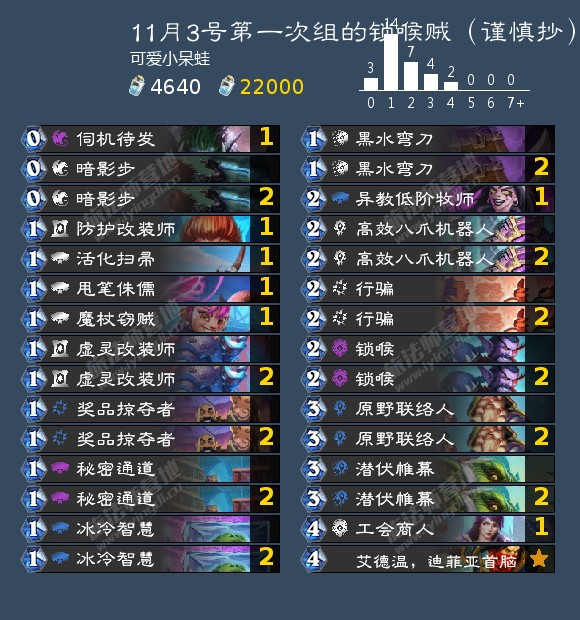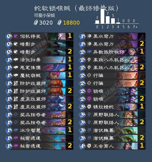大家好,我是可爱小呆蛙,之前是一名狂野玩家,在九月初接触了标准锁喉贼,便使用这套牌打进标准前两千,在九月末一次补丁之后,便一路高歌猛进打到最高第三的成绩,然后被吸血瞎打到100名。在11月3号的补丁后,我加入了两张新卡黑水弯刀,成功以32-9的战绩从156名成功登顶,叫我补丁战神(不是)。