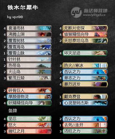 大家好,我是Xpz98,一位经常在MO玩薪传的牌手。在mh2推出之后,我继续坚持使用偷袭教诲参加比赛,取得了两次Challenge四强和一次八强的成绩,但随着新牌的不断开发,偷袭教诲的生存环境被极度压缩,URX龙猴的崛起导致我逐渐放弃玩了很久的偷袭教诲,期间尝试过很多其他种类的套牌换换口味,也有幸使用AllSpells打出过16分钟5-0速通薪传league(B站视频:BV1Nf4y1V71P),但成绩都不尽人意,直到发现了铁木尔犀牛这套有趣的套牌。