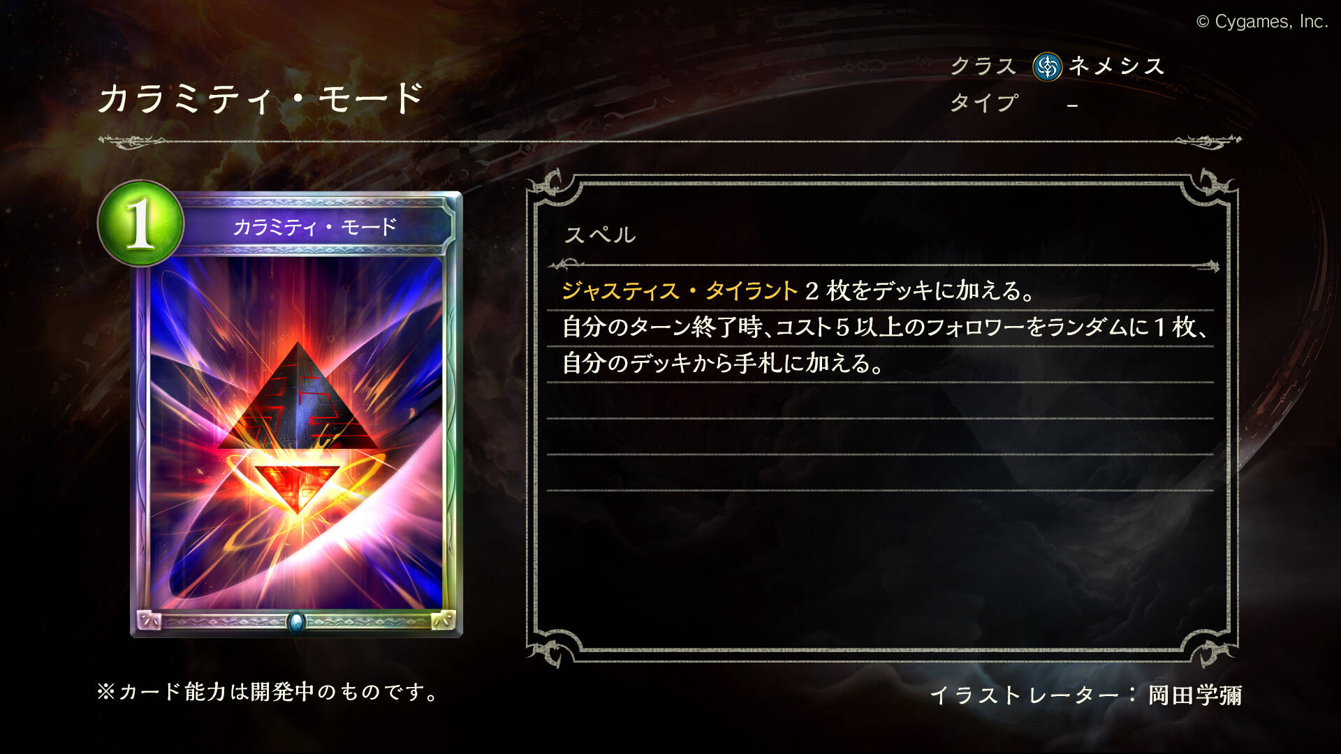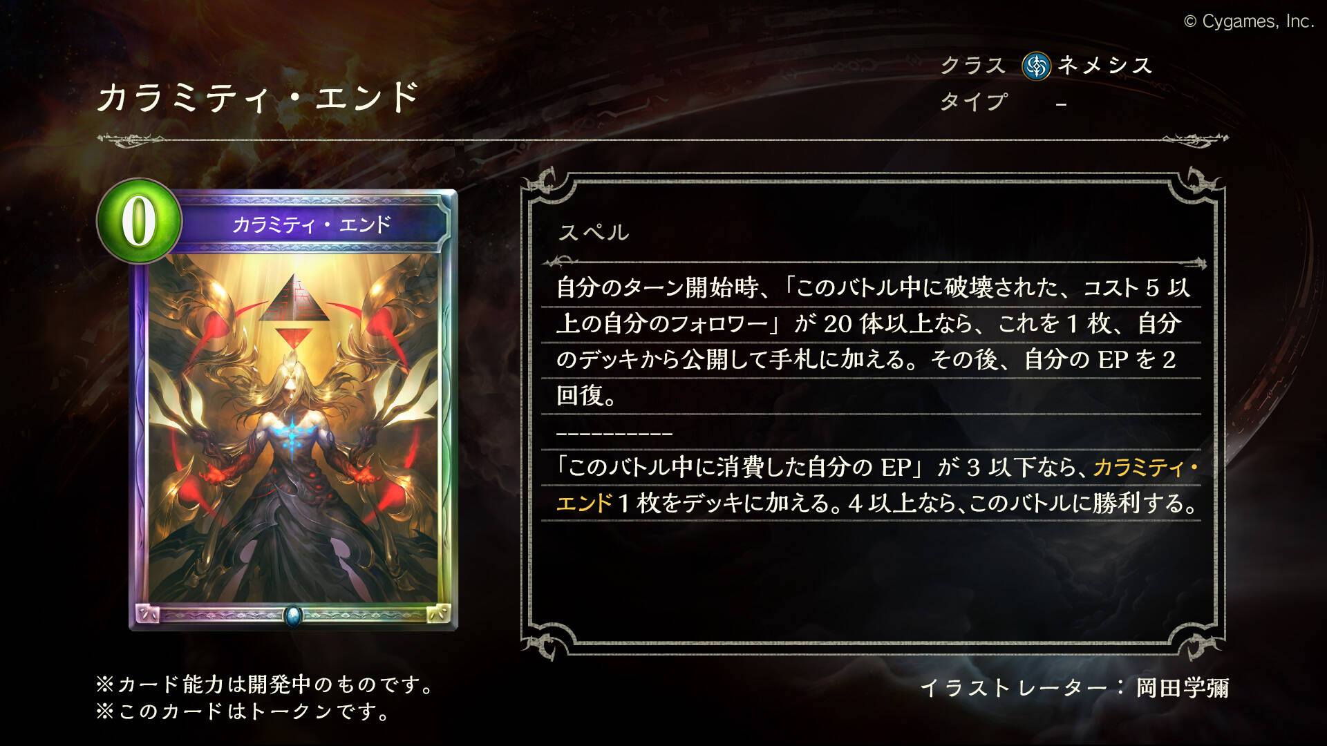 如果“本局对战中,自己已消耗的EP数量”为3或以下的话,则会增加1张灾厄终焉到牌堆中。如果为4或以上的话,则会获得本局对战的胜利。