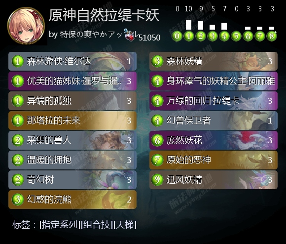 斩击妖是目前指定的最强思路之一,但除此之外,专注于组合技的拉缇卡妖也同样强力。携带自然体系能提升过牌能力,使万绿的回归·拉缇卡组合技更容易在第6回合达成。
