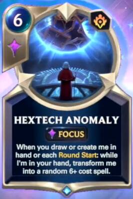 当己方抽到此牌、生成此牌置入手牌或回合开始:将手牌中的此牌随机变为一个6+消耗的法术(保留变形能力)。