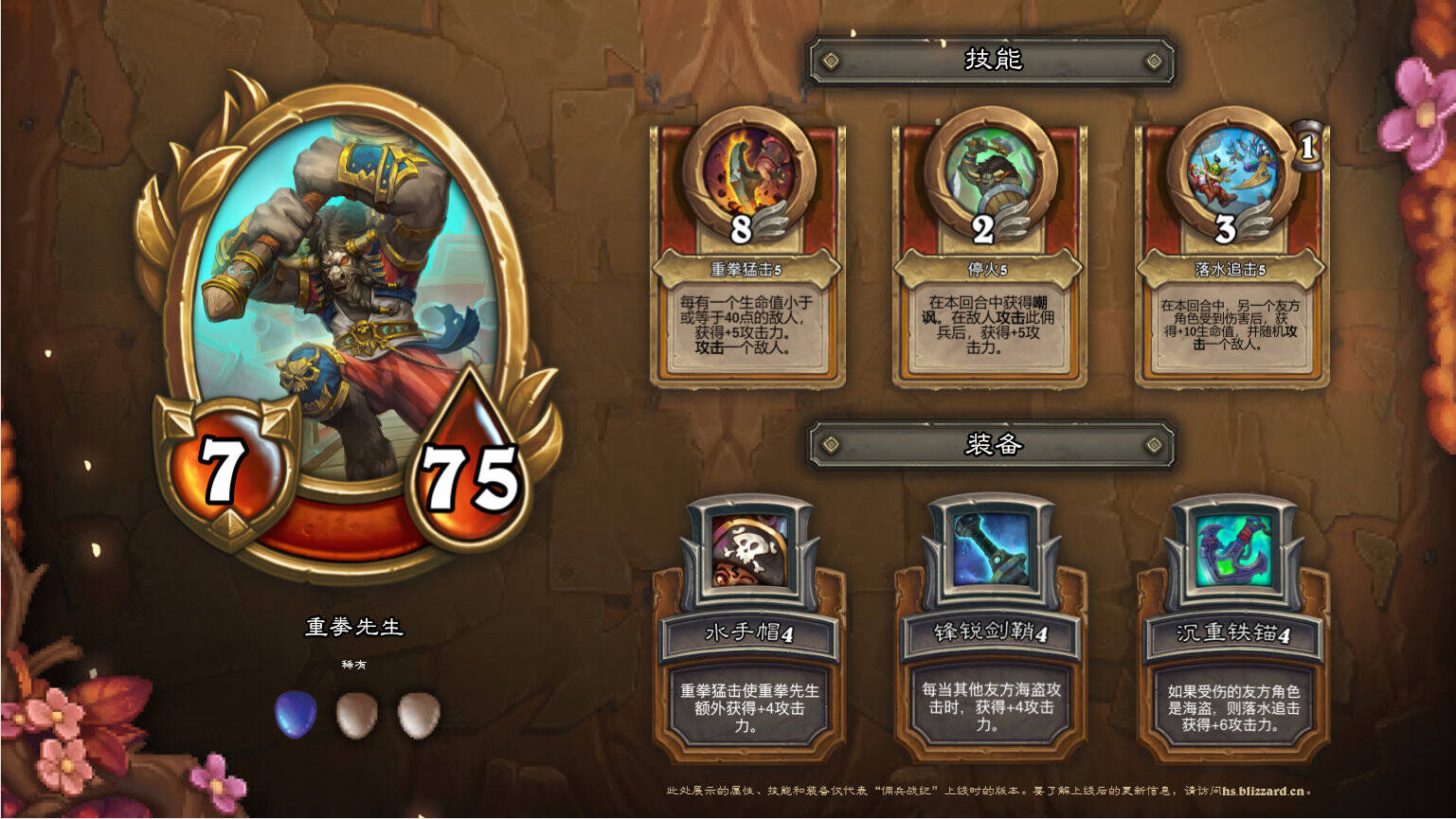 - 首脑的悬赏5:4速,冷却2。对一个敌人造成10点伤害。你每控制一个其他海盗,重复一次。击杀:恢复25点生命值。
