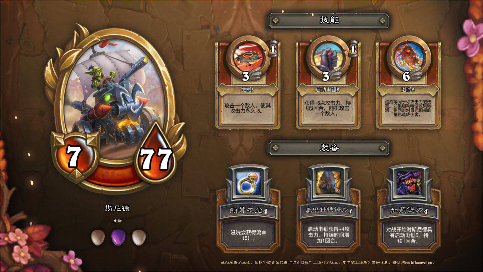 - 启动电锯5:3速,冷却1。获得+6点攻击力,持续2回合。随机攻击一个敌人。