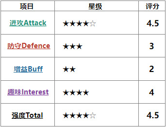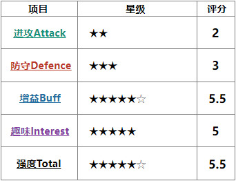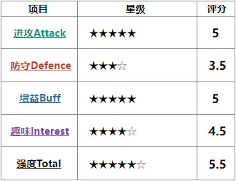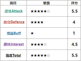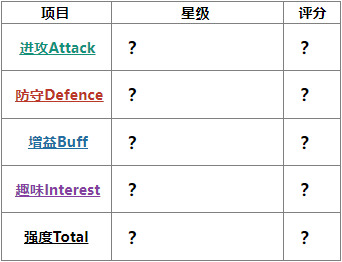 #目前暂定评分项目为进攻Attack、防守Defence、增益Buff、趣味Interest、强度Total 五项。星级为6★制。