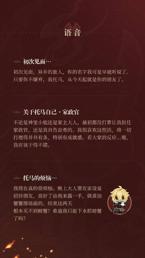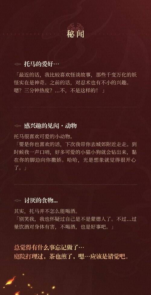 也许是受故乡轻松快乐的氛围影响,托马很擅长社交。虽说是外国人,却在稻妻本地建立了意想不到的强大人际网。