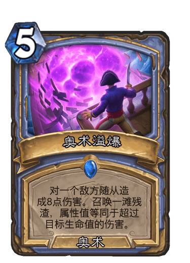 对一个敌方随从造成8点伤害。召唤一滩残渣,属性值等同于超过目标生命值的伤害。