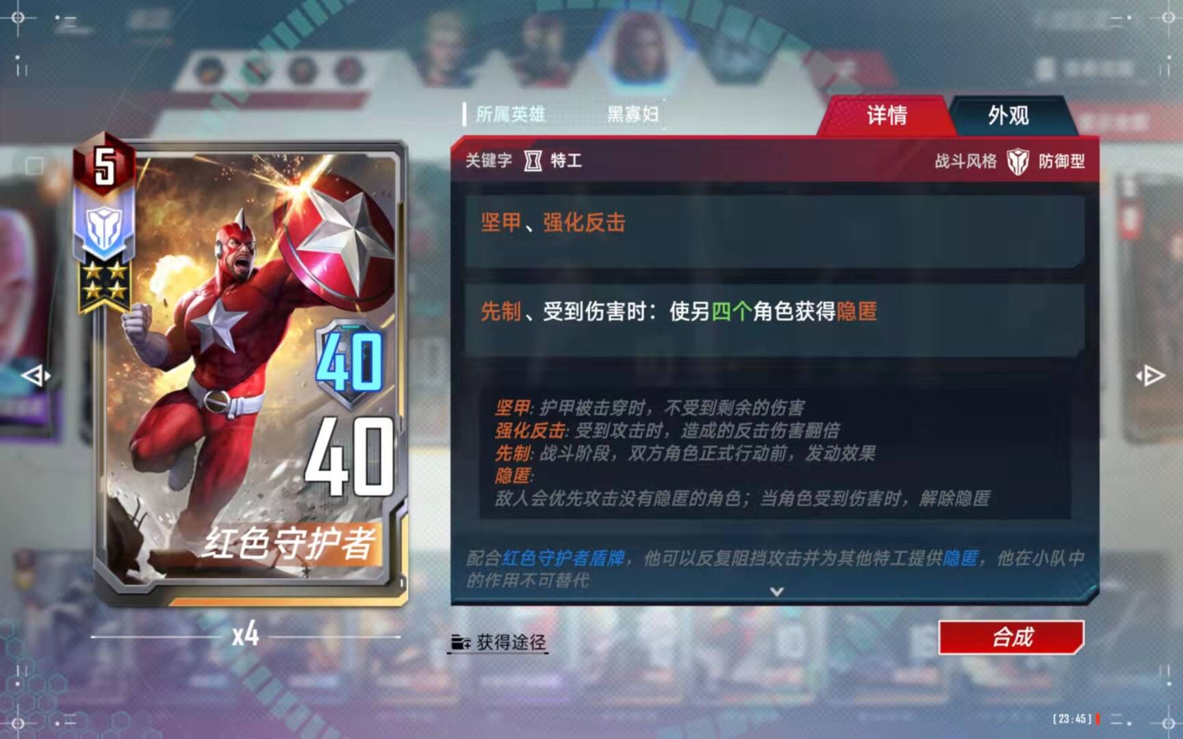和究极一样,红卫是本卡组确定寡妇配件多的时候,并且有黑寡妇在场的时候才会购买,他佩戴自己的盾牌可以让自己持续坚甲,从而增加本卡组的续航能力。