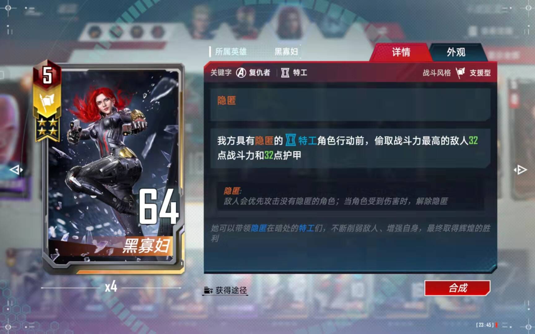 卡牌效果就不一一介绍了,这个就不介绍了,其中任意的关键牌来了,都直接上场,直到场上满场。任何六个组合都能吃鸡!但是前提是必须要有寡妇或者万能在场,寡妇在场的时候场上最少要有叶莲娜和红寡妇,这两个卡组都要会玩,这个卡组才能体现出比较高的容错率,从而避免 “黑寡妇”、“万能” 等单核卡组一直不来核心就崩盘的囧境。