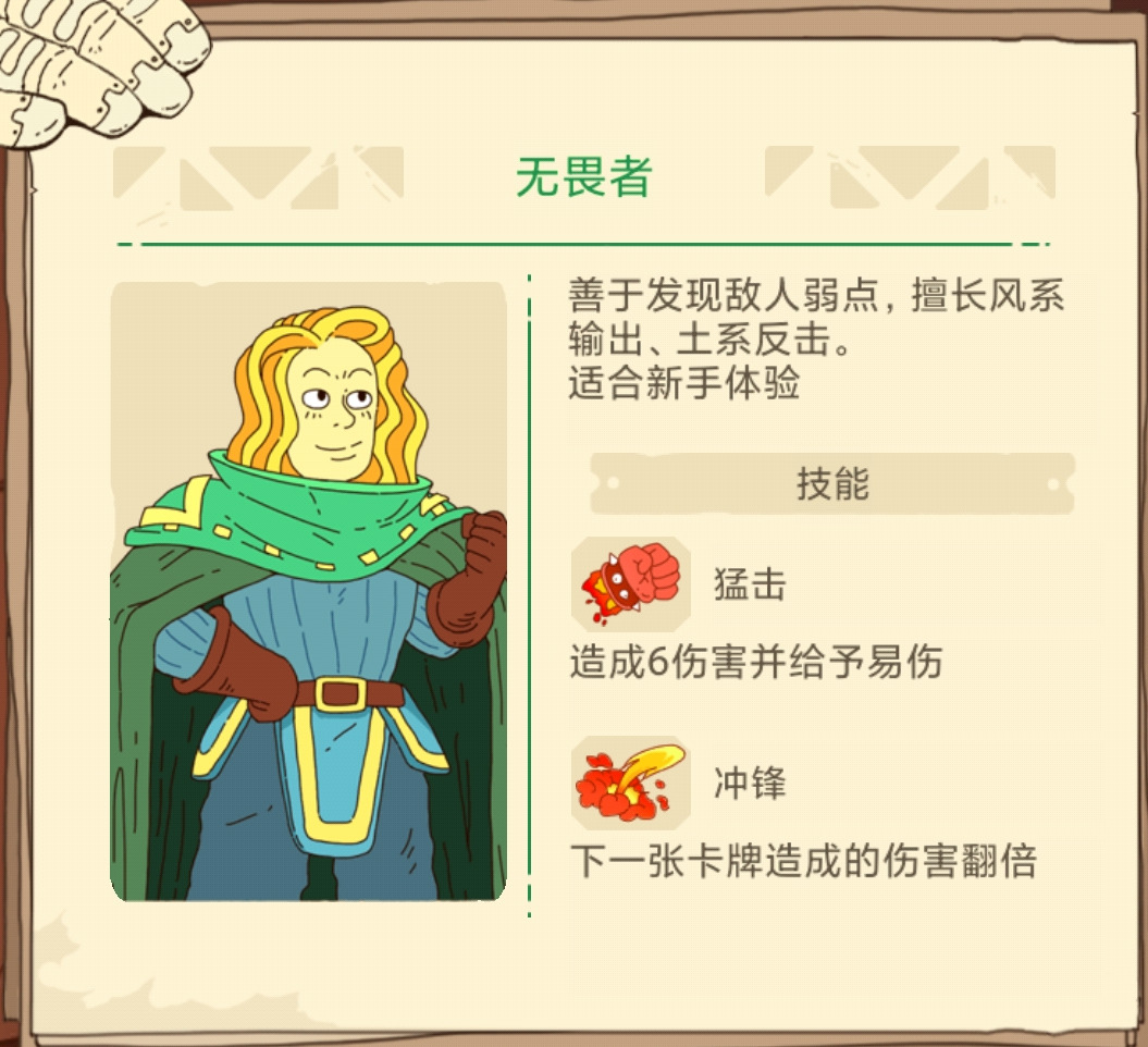 达到3级以后无畏者的2技能“冲锋”效果为下一章卡牌的伤害翻倍——这同样是一张起效简单粗暴的卡,但相对于1技能猛击,冲锋需要达成好的效果需要的条件更为苛刻,需要一些特定的卡牌作为适配才能达成更好的伤害效果,比如那些带有成长属性的卡牌(每次使用伤害增加)。