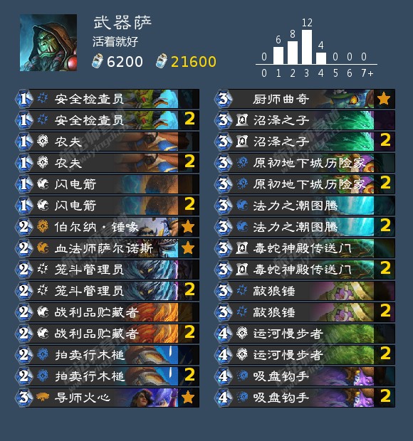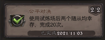 公平对决,使用试炼场后两个随从均幸存,完成20次 。因为要2个拉出来的随从都存活,所以我搜索了标准全部0攻怪,带上了这6个再加上安全检查员113,它可以被拉出来做成就,也可以把射手的随从洗回牌库里,还可以做瞎子成就,所以非常好用满编是必须的。