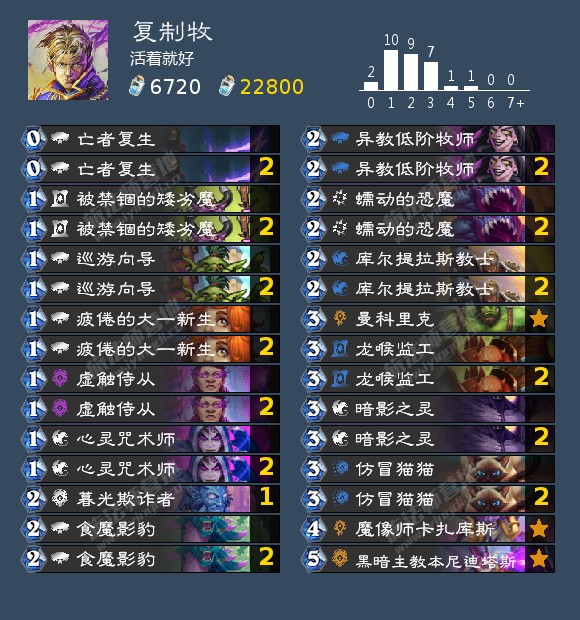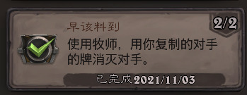 早该料到 使用牧师,用你复制的对手的牌消灭消灭对手 。就和核心成就里贼的大范女儿一个原理,带上脏牌偷对手的随从或者直伤斩杀毒死就完事了,所以就用快攻暗牧,把补刀留给脏来的牌就完事了。