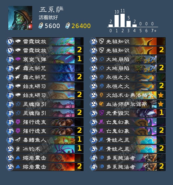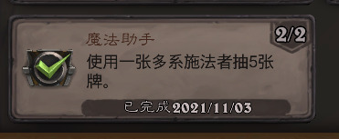 魔法助手 使用一张多系施法者抽5张牌 。有5种派系法术的职业并不多,所以这里用了萨满,狂野的蛙灵体系,过牌很快的,第一章多系施法者也可以用来过牌。5系法术都用了后,再用多系施法者就完事了。