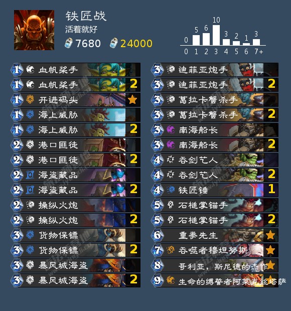 攻略就是起手找铁匠锤还有海盗藏品,然后就是交易回卡组再用卡的效果定向抽取铁匠锤。因为海盗藏品自带+1耐久,所以2次海盗藏品就可以做完这个成就了。