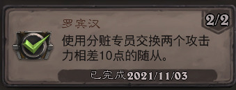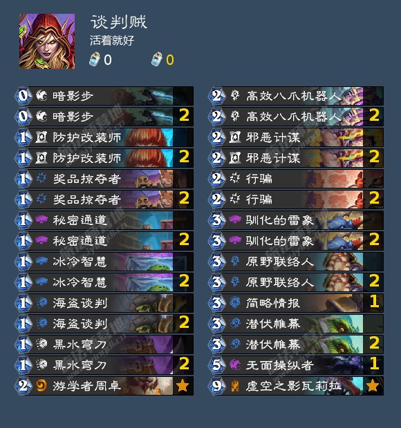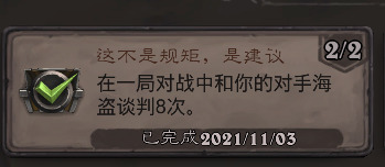 其实这个成就还可以用爆牌贼这样能让对手快速过牌的贼卡组,过牌攒到2张海盗谈判,然后等你的对手牌库就剩一张时,就可以用2张海盗谈判反复交换,8次就完成这个成就了。