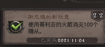 斯尼德的新玩意 使用哥利亚的火箭消灭100个随从 。这种反复使用一种随从战吼的成就自然只需要我们的老朋友黑门术了,定向检索加减费,然后亡者复生反复回收就完事了。