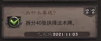 为什么要选? 拆分40张抉择法术牌 。经过测试曾经的德鲁伊橙223没法做成就,所以还是只能用应急木工做成就。这个成就需要大量抉择法术,因此我选择了任务德,带上了铜须小熊猫蛇发女妖反复使用木工的战吼就完事了。