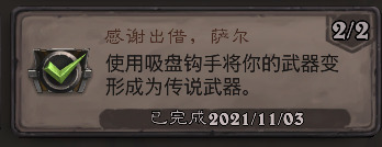 感谢出借,萨尔 使用吸盘钩手将你的武器变形成为史诗或传说/传说武器 。这个成就很简单,毕竟标准的武器牌就那么几张。多试几次就完事了。