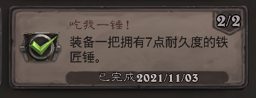 吃我一锤! 装备一把拥有7点耐久度的铁匠锤 。这个成就只需要反复洗和抽铁匠锤就完事了,所以满编抽武器的卡就好了,战士的任务还有海盗藏品都可以。