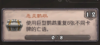 恶灵鹦鹉 使用巨型鹦鹉重复16张不同卡牌的亡语 。这个成就有bug,导致作者我没法全成就。本身这个成就并不难,带上鹦鹉和抽野兽的卡,然后带上各种低费亡语怪,送掉下鹦鹉就完事了。