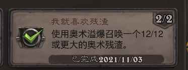 我就喜欢残渣 使用奥术溢爆召唤一个12/12或更大的奥术残渣 。这个成就就堆法强就完事了,打1血怪13点伤害就完事了,因此法强至少5点,因此选择用任务法做这个成就,剩下的法强就用随从提供了,因此决斗大师和艾格文都带上,始生研习也可以找凤凰之类的。然后就是边做任务边攒牌,法强够了,一次奥术溢爆就完事了。