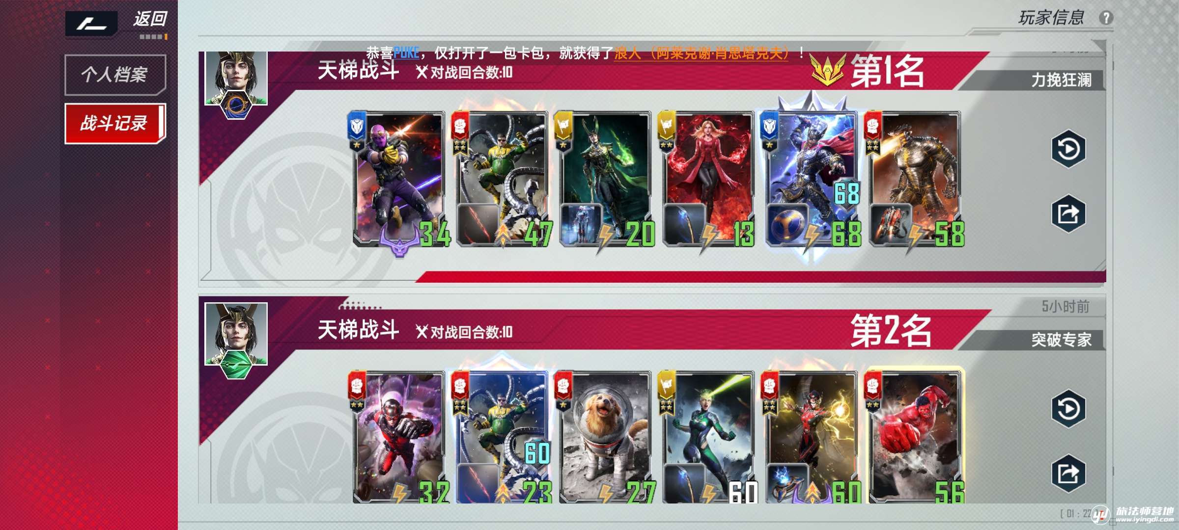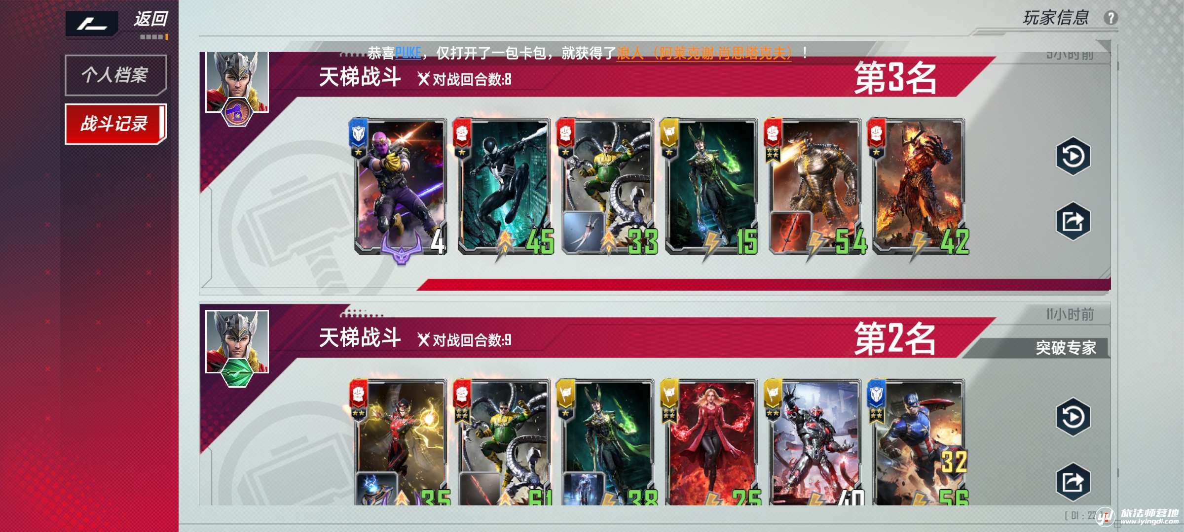 所以在这种环境里,怎么才能在卡牌不齐全的情况下吃烂分甚至保二争一呢,那么就让我来隆重介绍一下我自己根据我开出来的卡组出来的宇宙光牙卡组,理论上这种玩法完全可以根据自己所拥有的卡进行各种调整,只要掌握了大致的思路相信大家在不同的环境里都可以找到自己卡组生存的位置。这是一套既能玩复仇者,又能玩洛基又能玩别人的凯旋的卡组!大家可以看下我昨天打的战绩∠( ᐛ 」∠)_